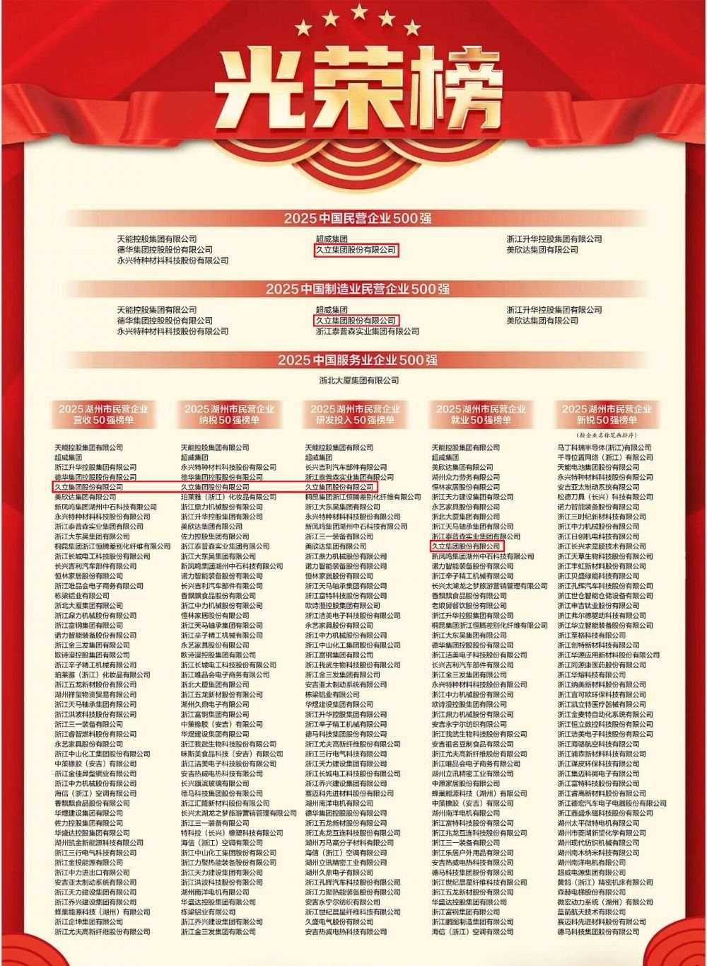 開幕式現(xiàn)場還發(fā)布了2025年湖州市民營企業(yè)“營收、納稅、研發(fā)投入、就業(yè)、新銳”等五張50強系列榜單,久立集團成功上榜四項:2025年湖州市民營企業(yè)營收50強、2025年湖州市民營企業(yè)納稅50強、2025年湖州市民營企業(yè)研發(fā)投入50強、2025年湖州市民營企業(yè)就業(yè)50強。